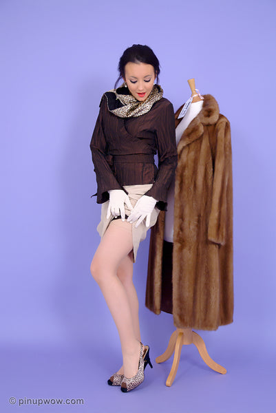 When gorgeous Pin-Up Rachael spots an antique coat for sale, her will power crumbles. She just has to feel it against her skin! Spotting an opportunity, our lovely girl decides to treat us by letting us stay and watch her naughty fur coat striptease!
