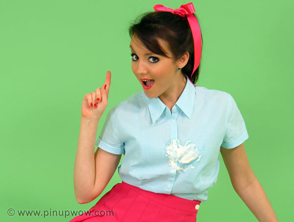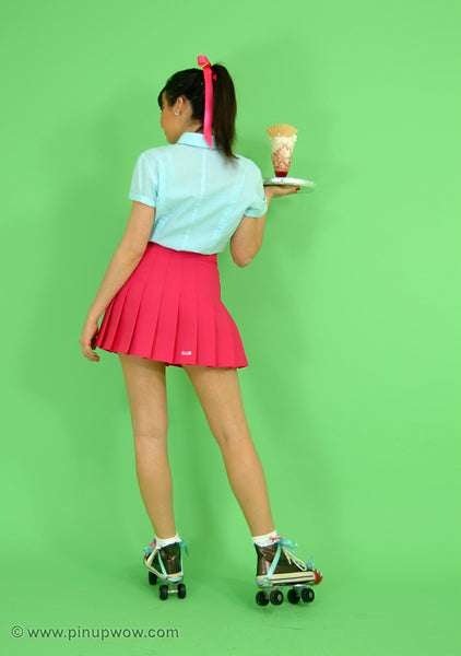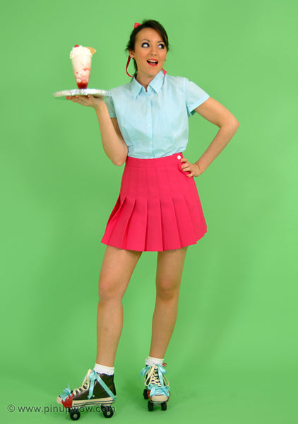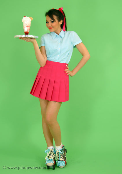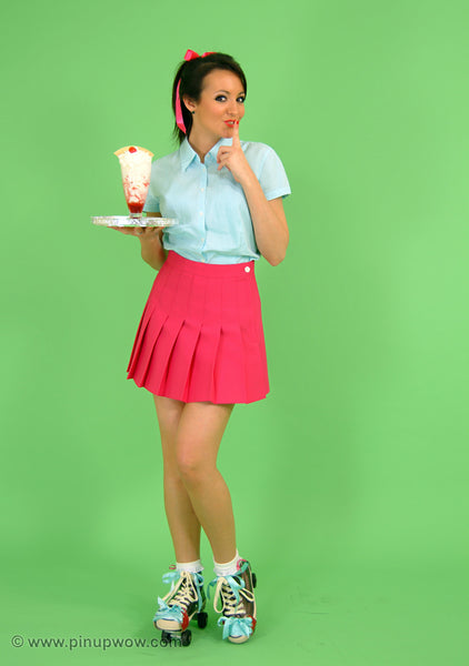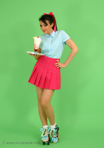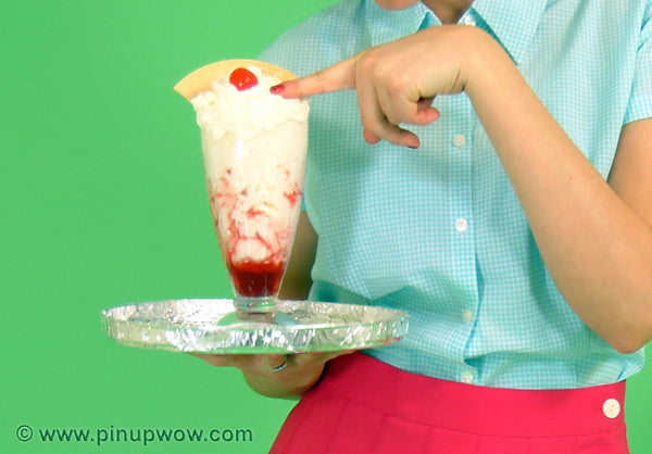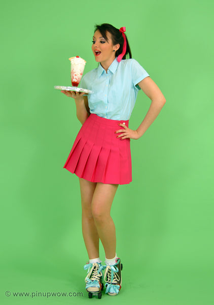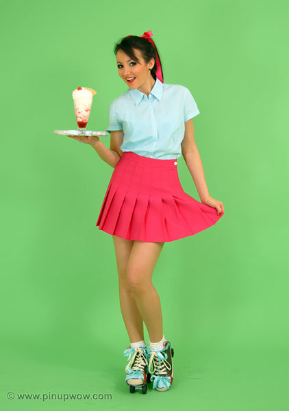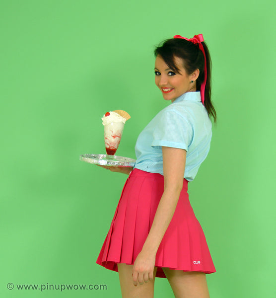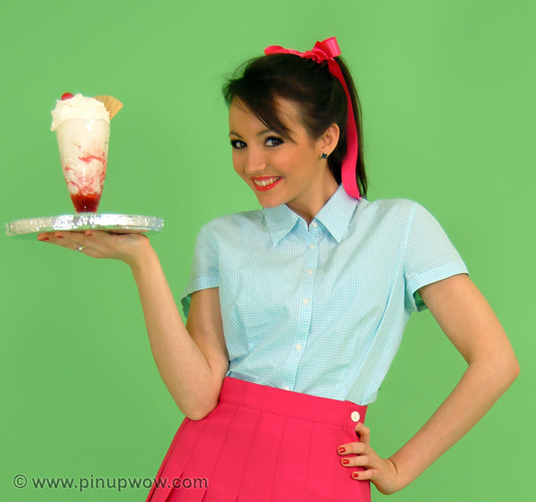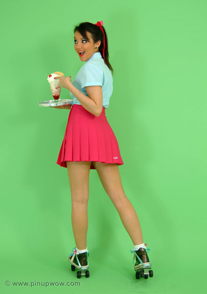 Sparkling Pin-Up Rachael has taken a holiday job serving knickerbocker glories. In her cute short red skirt, it’s no wonder she has so many orders. If she fell over, that ice cream would go all over her clothes. Quick Rachael, here comes another order!